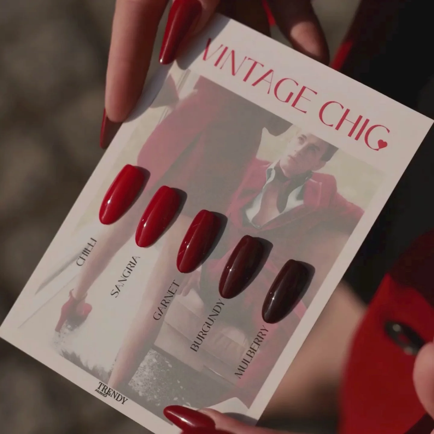 Um vermelho profundo quase preto, como a seda mais fina. Sofisticado, magnético, irresistível: veste as unhas como um acessório de alta costura, transformando cada look em uma obra de arte. É a escolha para quem não tem medo de se destacar.